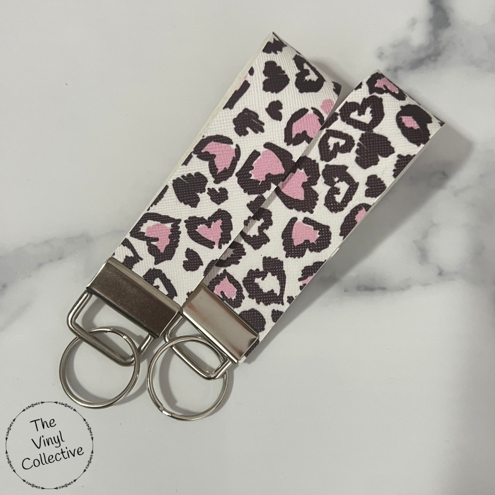 Our Pink Love Heart Leopard Wristlets / Key Fobs are handcrafted by The Vinyl Collective and make the perfect accessory or gift for any occasion.