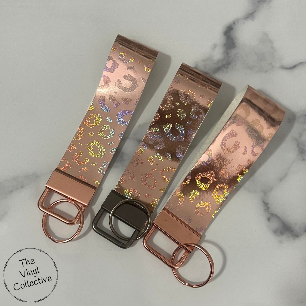 Our Rose Gold Leopard Wristlets / Key Fobs are handcrafted by The Vinyl Collective and make the perfect accessory or gift for any occasion.