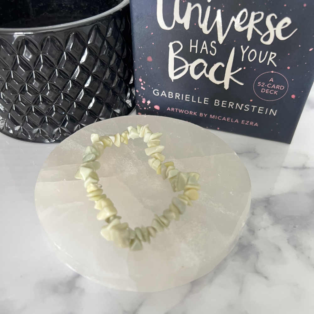 Serpentine Chip Bracelet. Serpentine will help with healing on all levels (mental, emotional, and physical). Serpentine forms a unique connection to promote healing in the way that is best for each individual. Serpentine can be used to attract/manifest what you want into your life–abundance on all levels, prosperity, love, healing, etc. It aligns your intent with the Heart Chakra and Source energy.